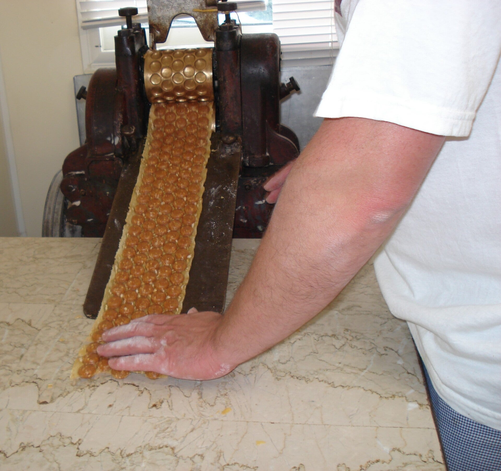 La Nougatine de Nevers est un caramel dur avec des amandes hachées (= nougatine des pièces montées). On le passe dans notre rouleau à empreinte et on obtient des "nougatons". Ces derniers sont enrobés à la main avec une cuillère de glace royale (meringue vanillée de couleur orange)